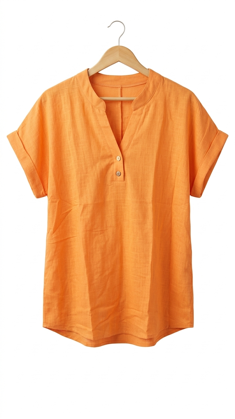 La Blusa de Lino Naranja Mandarina con Cuello Henley – Talla L combina estilo y comodidad en una sola prenda. Con su vibrante color mandarina y su diseño Henley, esta blusa se convierte en un destacado básico que realza tu personalidad y le da vida a cualquier atuendo.