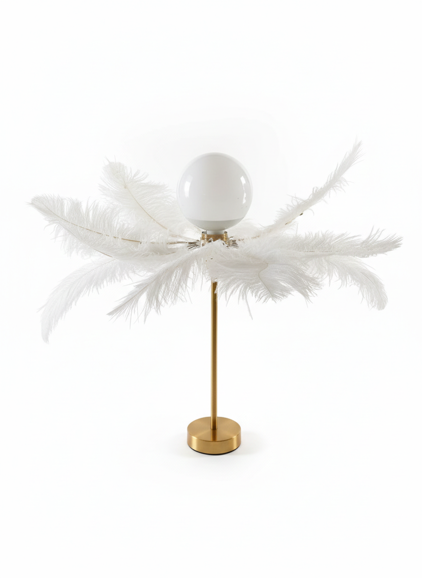 La lámpara está hecha con materiales seleccionados que garantizan durabilidad y una apariencia impecable. Las plumas blancas aportan ligereza visual, mientras que el detalle dorado añade un toque de lujo, convirtiéndola en el complemento perfecto para salas de estar, dormitorios u oficinas.