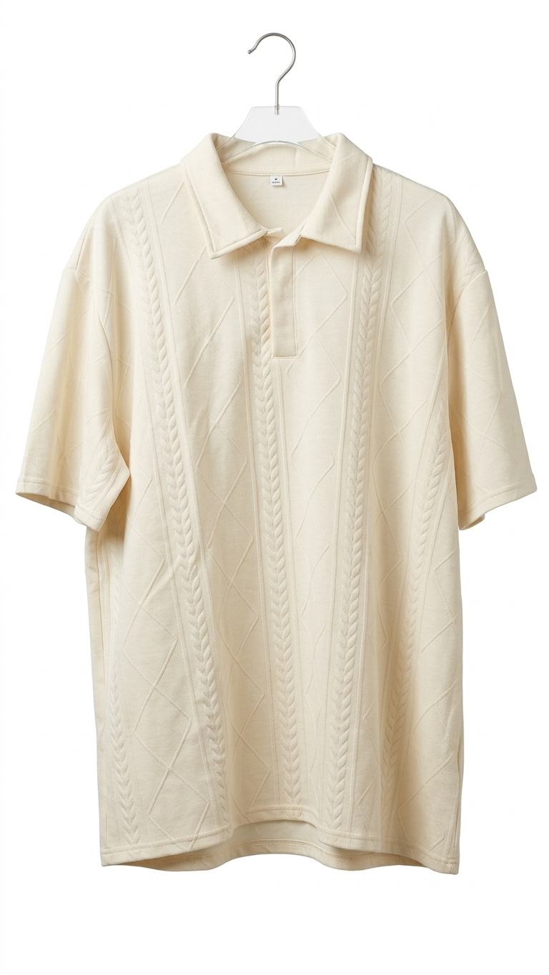 Descubre el polo de punto texturizado en color crema que combina a la perfección estilo y practicidad. Este diseño sofisticado con relieve añade un toque único a tu outfit, ideal para aquellos que valoran la moda con detalles exclusivos.