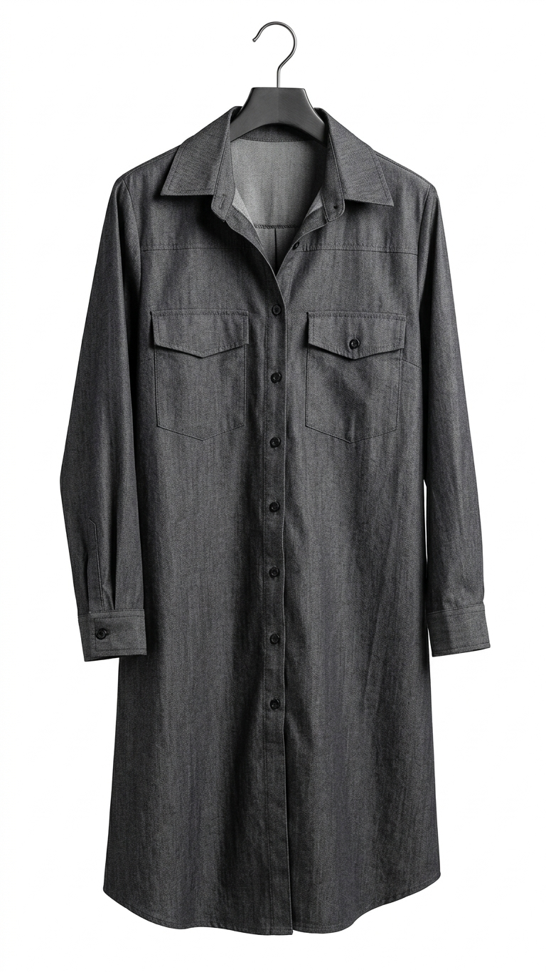 El vestido cuenta con manga larga que te brinda comodidad en todas las estaciones y bolsillos prácticos para añadir funcionalidad sin sacrificar estilo. Su acabado en denim gris oscuro no solo es moderno, sino que también asegura durabilidad.
