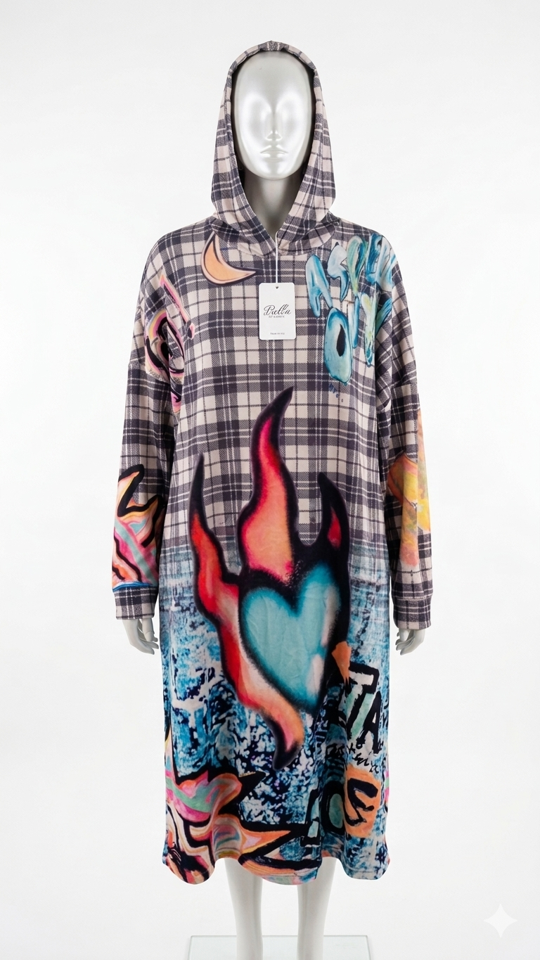 Parte de la Colección Urban Art, este vestido destaca por su capucha funcional y su ajuste oversize, ofreciendo un toque vanguardista. Perfecto para combinar con zapatillas deportivas o botas, adaptándose tanto a días casuales como a momentos especiales.